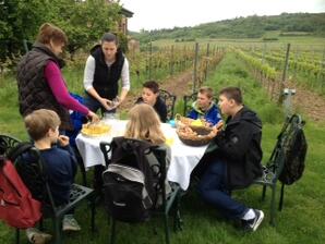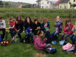 Die Klasse 5d wanderte von der Schule aus durch die Weinberge zum Weingut Gaul. Dort angekommen, machten die Schülerinnen und Schüler Bekanntschaft mit der Winzerin Karoline Gaul, die das Weingut zusammen mit ihrer Schwester Dorothee führt. Die Winzerin erzählte zunächst von ihrem Vater Karl-Heinz, der das Weingut 1993 gründete. Dann begann die Führung im kleinen Keller, wo viele verschiedene Weinsorten gelagert werden. „Besonders toll fand ich am Ende das Probieren des Traubensaftes“, erzählt Charlotte. „Aber auch die Maschinen waren toll, wie zum Beispiel die Kelter und die Etikettiermaschine. Auch der Weinprobierraum und der große Keller mit den Fässern war sehr beeindruckend“, findet Laura. Am interessantesten fanden die Schülerinnen und Schüler die Information, dass das Weingut 20 ha Rebfläche bewirtschaftet und der größte Weinberg „Goldberg“ heißt. Am Ende durften alle noch ein großes Glas Traubensaft trinken. (Laura Mayer, Charlotte Stöber, 5d)
