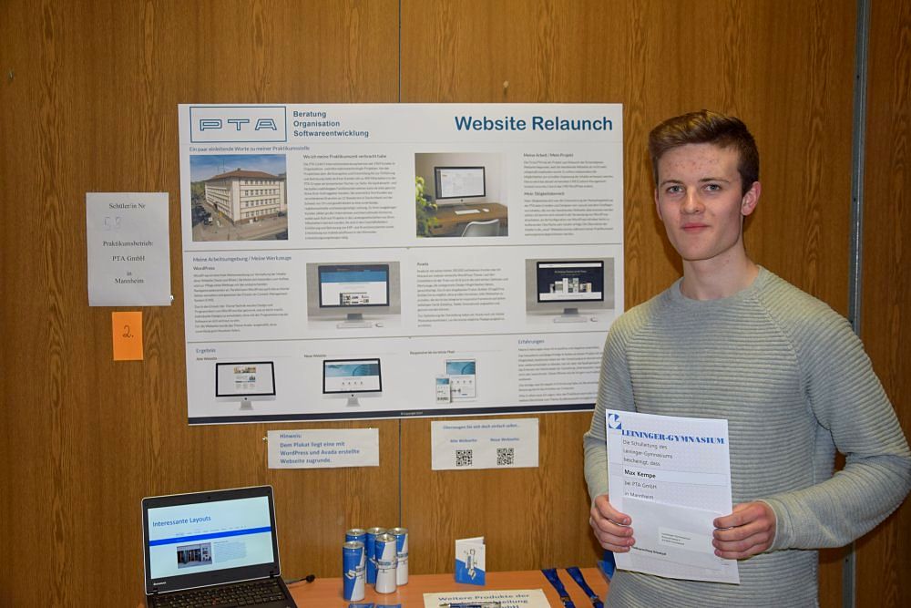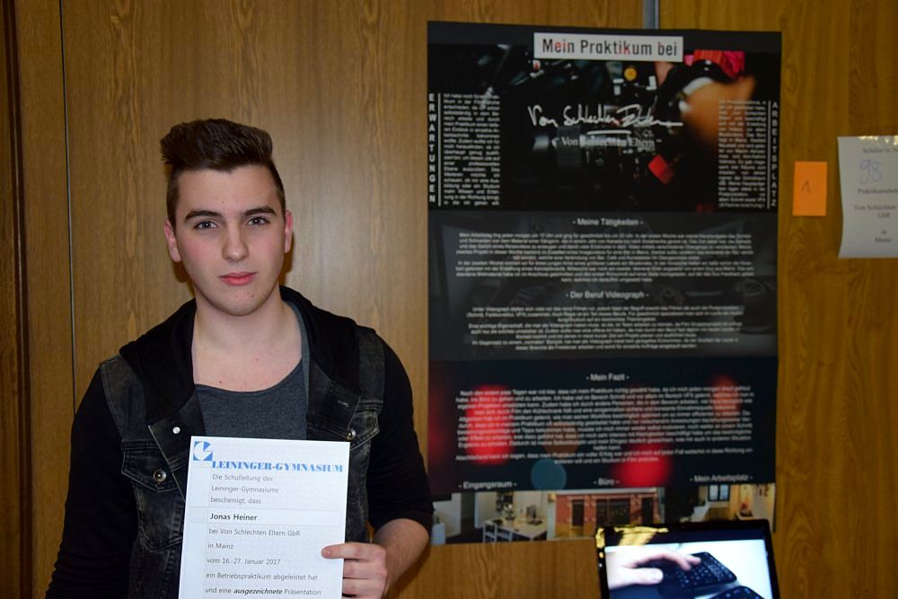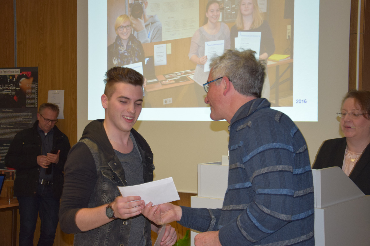 Bei der Preisverleihung am 15.2.2017 erhielt Jonas Heiner den 1. Preis; er absolvierte sein Praktikum bei Von schlechten Eltern GbR in Mainz. Platz 2 errang Max Kempe, er war bei PTA GmbH in Mannheim gefolgt von Patrick Bogenfeld auf Platz 3 , der sein Praktikum bei der Deutschen Telekom AG in Berlin machte. Insgesamt nahmen 106 Schülerinnen und Schüler mit 100 Präsentationen an dem Wettbwerb teil, von denen 36 einen Preis erhielten. Wir gratulieren allen Preisträgerinnen und Preisträgern und danken nicht nur den Mitgliedern der Jury, sondern auch allen Sponsoren und den Unternehmen und Institutionen, die auch in diesem Jahr wieder Praktikumsplätze zur Verfügung gestellt haben.