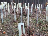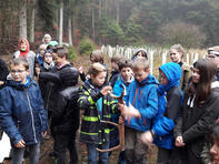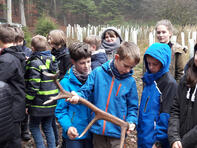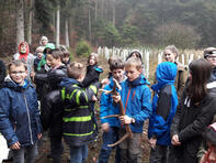 Mit guter Laune begann im Bus die Fahrt nach Höningen zum Schulwald des Leininger-Gymnasiums. Als wir ankamen wurden wir vom Förster und seinen Hunden Alma und Epon herzlich begrüßt. Eine Weile durften wir mit den Hunden spielen und sie streicheln. Danach erzählte der Förster uns ein bisschen etwas über die Rehe und Wildschweine, dabei ließ er die Beine der Tiere rumreichen. Nun erklärte er, wie wir unsere Ahornbäume pflanzen sollten. Aber davor suchten wir uns erst einmal einen Partner aus. Zuerst mussten wir uns ein Bäumchen mit Wurzel nehmen und so tief graben, bis die Wurzel reinpasste. Als nächstes hielt einer das Bäumchen, der andere grub es mit Erde zu und versah es mit einer Schutzmanschette aus Plastik. Die Manschetten sollen die Bäumchen vor Hirschen, die ihr Geweih an der Rinde kratzen, schützen. Wir befestigten den Schutz an einem langen Pfahl, der tief in die Erde gesteckt wurde.