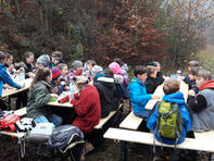 Nach dem Einpflanzen der Bäumchen wanderten wir weiter zur Schulwaldhütte. Dort erwartete uns ein Mittagessen mit Lagerfeuer. Zwei Mütter bereiteten ein leckeres Buffet bei der Hütte vor. Nun schnitzten wir unsere Stöcke und genossen das Essen am Lagerfeuer. Danach liefen wir zurück zum Bus und fuhren zur Schule zurück.