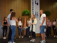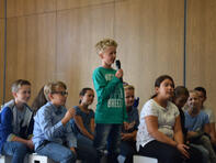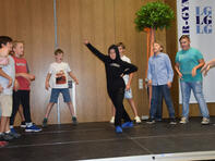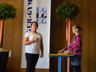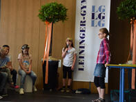 so riefen es die Kinder der Klasse 6A den frisch gebackenen Schülerinnen und Schülern des LG mit ihren Eltern und Angehörigen zu, welche am 1. Schultag (14.08.2017) die Reihen der Aula bei der Aufnahmefeier füllten. “ LG“ steht dabei für „Leininger-Gymnasium“, was die Schulleiterin Frau Diehl in ihrer Ansprache jedoch in Frage stellte. Vielleicht steht das „L“ ja auch für „lehrreich“ oder „lustig“? Oder gar „langweilig“? Letzteren Eindruck konnte man jedoch bei dem Willkommen, welches die Mitglieder der Schulgemeinschaft den 96 Mädchen und Jungen bereiteten, nicht bekommen. Stellvertretend begrüßte die Musikklasse der sechsten Jahrgangsstufe unter Leitung von Frau Egeler-Wittman und Herrn Dhein die Neuen mit Musik, Tanz und Theater. Eindrücklich konnten sie darstellen, wie eine Stunde am Leininger-Gymnasium wirklich abläuft. Auch die 16 Tutoren/Tutorinnen (Schülerinnen und Schüler der zehnten Klassen) stellten sich den vier neuen fünften Klassen vor, indem Sie als Pressevertreteter auftraten und in verschiedenen Interviews mit Schülerinnen und Schülern ihrer Schule das Leben am LG verdeutlichten. Und so erfuhr das interessierte Publikum auch, welches Ereignis für Frau Diehl in den letzten Jahren zu den lustigsten zählte. Ja, auch Lehrer haben gute Tage am Leininger-Gymnasium!