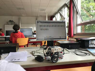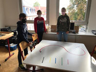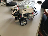 Während dieser Woche arbeiteten die Schüler:innen der Klassenstufen 6 bis 8 mit dem LEGO Mindstorms EV3 Bausatz, sowie mit der zugehörigen Software. Der Programmcode für die Steuerung wurde durch die Schüler:innen in Partnerarbeit selbst erstellt. Zu Beginn der Kinder-Technik-Woche wurde ein kleiner autonom agierender Roboter konstruiert, der sich mithilfe von Elektromotoren bewegt und verschiedene Aufgaben, wie z.B. einen Parcours mit Hindernissen befahren, bewältigen musste. Durch den Programmcode der Schüler:innen fuhren am ersten Tag die LEGO-Roboter einfache Wege entlang vorgegebener Strecken.