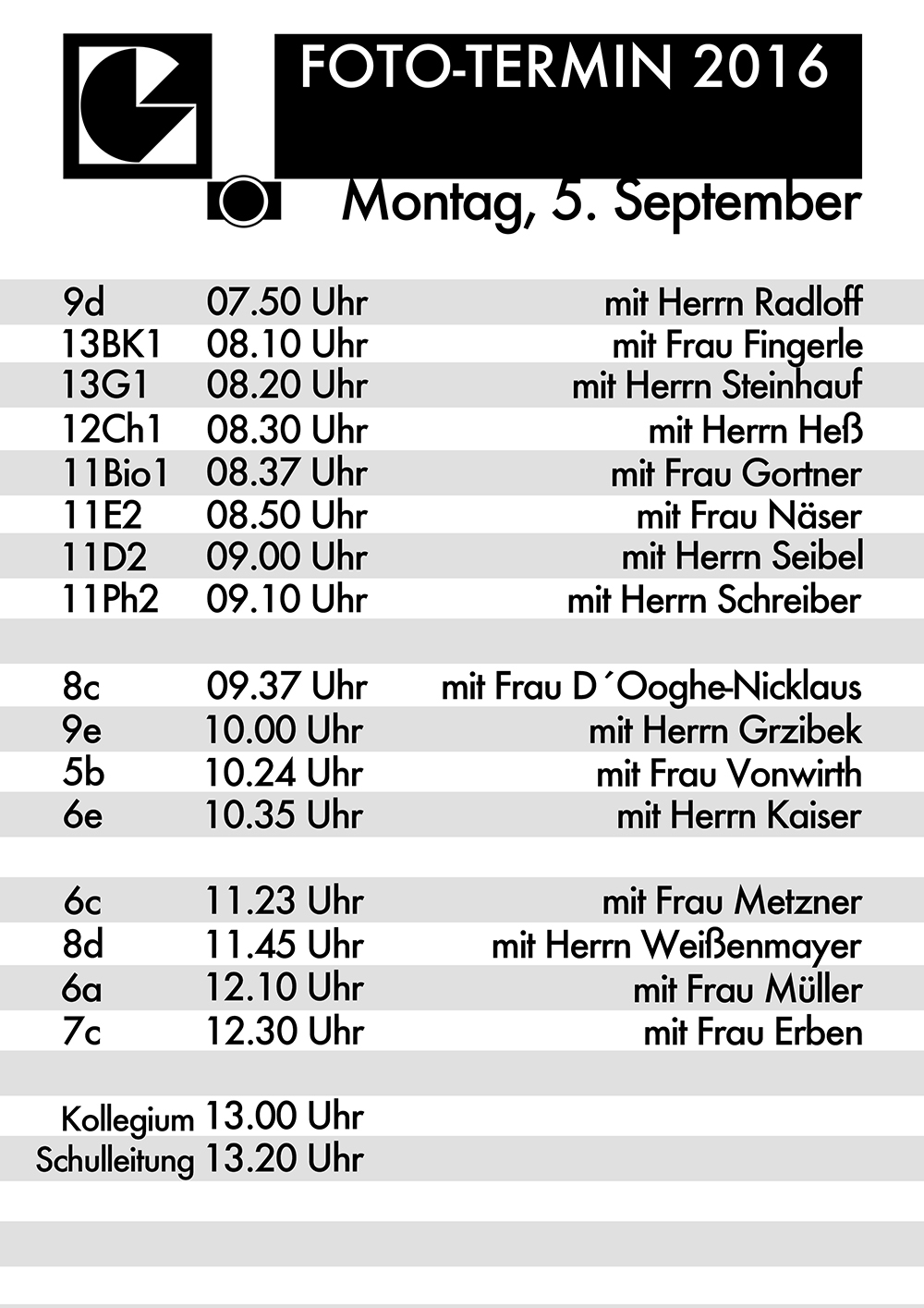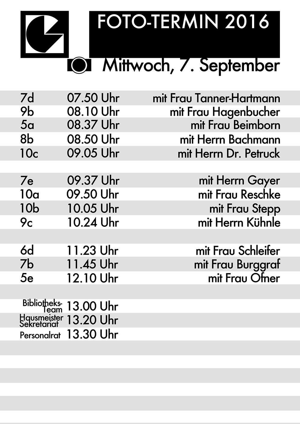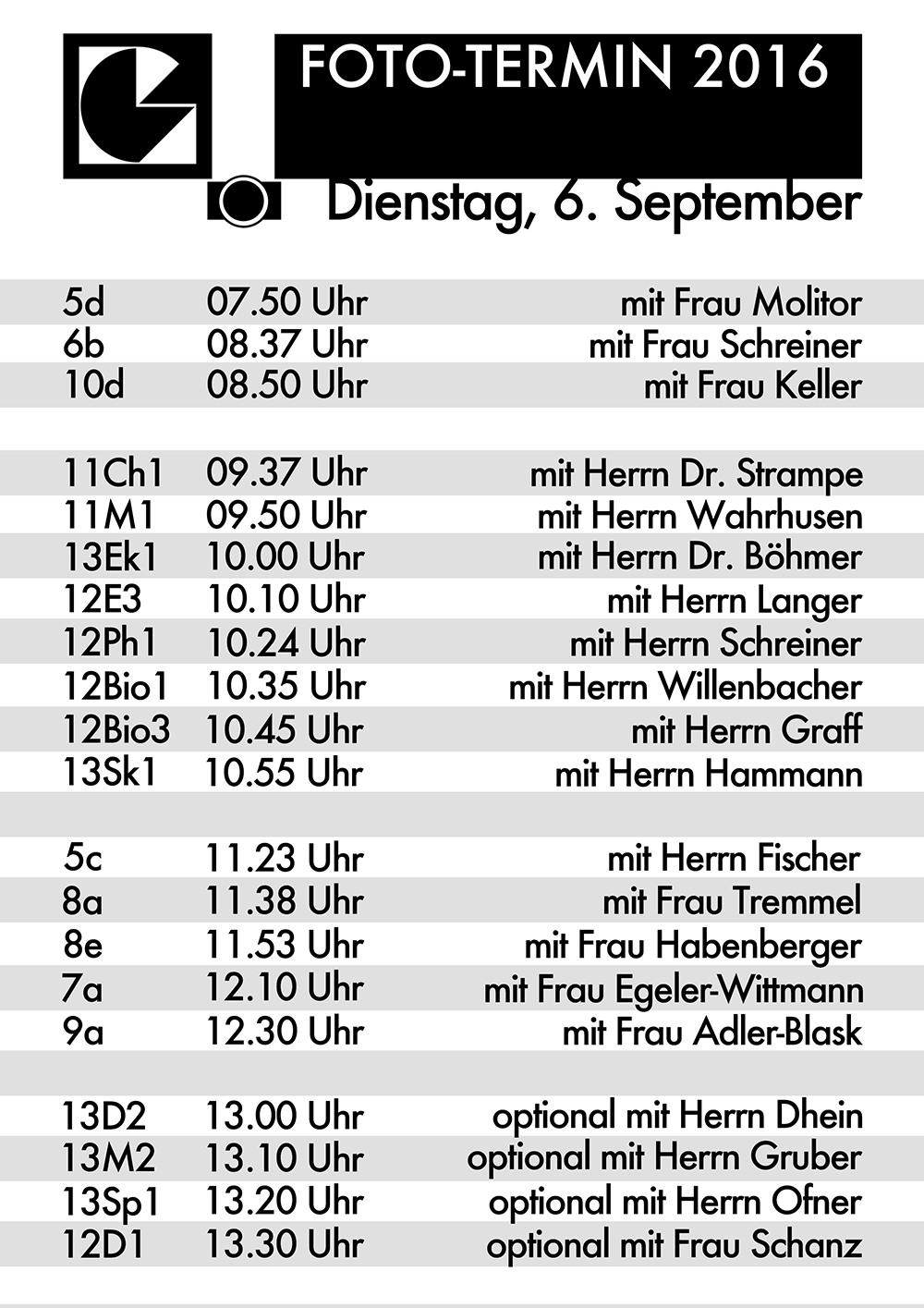 Zu welchem genauen Termin welche Klasse bzw. welcher Stammkurs fotografiert wird, kann den unten angefügten Plänen entnommen werden.