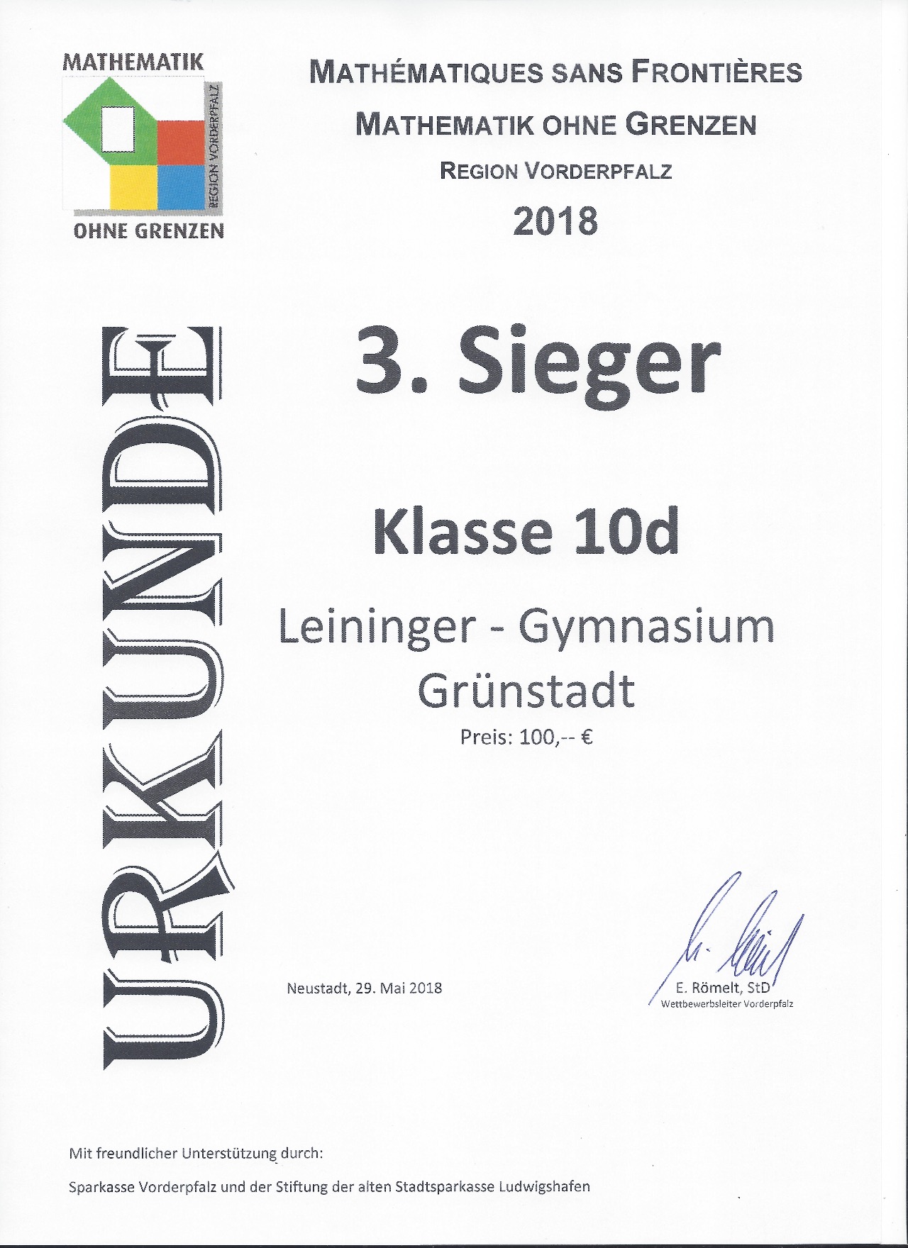 Am Dienstag letzter Woche (29.5.2018) fand die Preisverleihung für den Wettbewerb "Mathematik ohne Grenzen" am Kurfürst-Ruprecht Gymnasium in Neustadt/Weinstraße statt. Dieser Wettbewerb fand (schon) am 6.2.18 statt, die Preisverleihung erst jetzt.