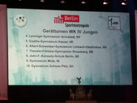 Nach den ganzen Anstrengungen des vorherigen Tages war am letzten Tag in Berlin erst einmal Ausschlafen angesagt. Nach dem gemeinsamen Frühstück, das wie die Tage zuvor vom Lösen eines Kreuzworträtsels begleitet wurde, machten wir uns zusammen auf in Richtung Kurfürstendamm. Nach ein paar kleineren Erledigungen und einer kulinarischen Stärkung bei McDonalds besuchten wir schließlich das KaDeWe (Kaufhaus des Westens), das uns mit seinen hochwertigen Marken und Preisen faszinierte. Einen sportlichen Abschluss unserer Reise erlebten die Schüler/innen gemeinsam mit Herrn Bachmann auf der Trampolin-Anlage im Jump-House, wo sie noch einmal ihr ganzes turnerisches Können zeigten. Am Abend fanden die Abschlussfeierlichkeiten mit Ehrung der preistragenden Mannschaften statt. Auch unser Team wurde namentlich auf Platz 4 in der Rangliste aufgeführt. Nach einigen spektakulären Showeinlagen beendete ein kleines Privatkonzert von Winzent Weiss und die von einem DJ verbreitete Diskostimmung die Veranstaltung.