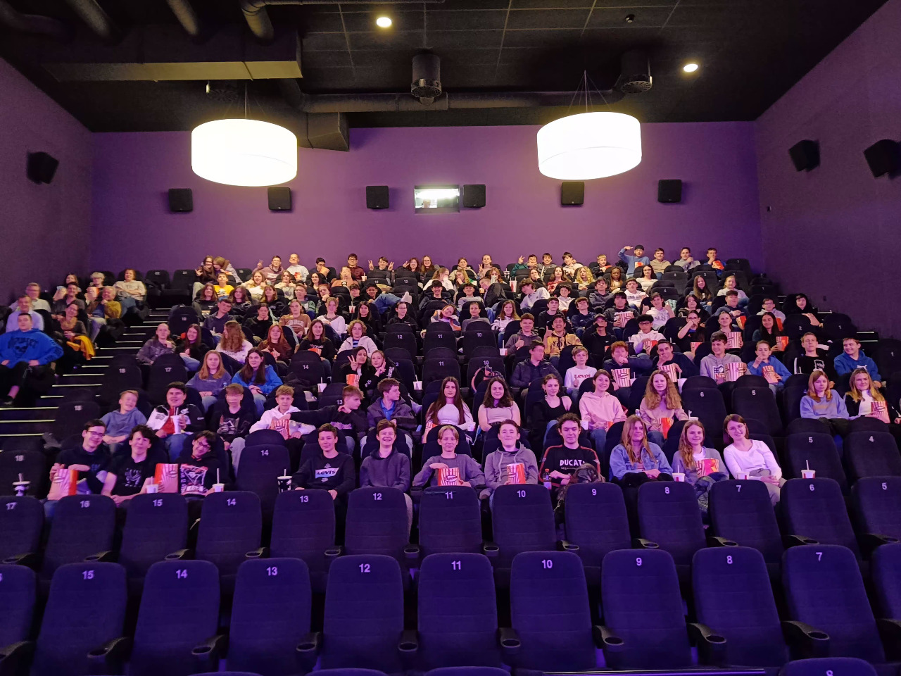 Um ungefähr 9:30 Uhr trafen sich die Schüler mit ihren Lehrern, Frau Habenberger, Herr Anschütz, Herr Graff, Frau Metzner, Herr Gayer und Herr Richter am Haupteingang des Leininger Gymnasiums, um zusammen zur Filmwelt Grünstadt zu laufen. Dort angekommen durften sie nach kurzem warten auch schon ihre Plätze einnehmen.