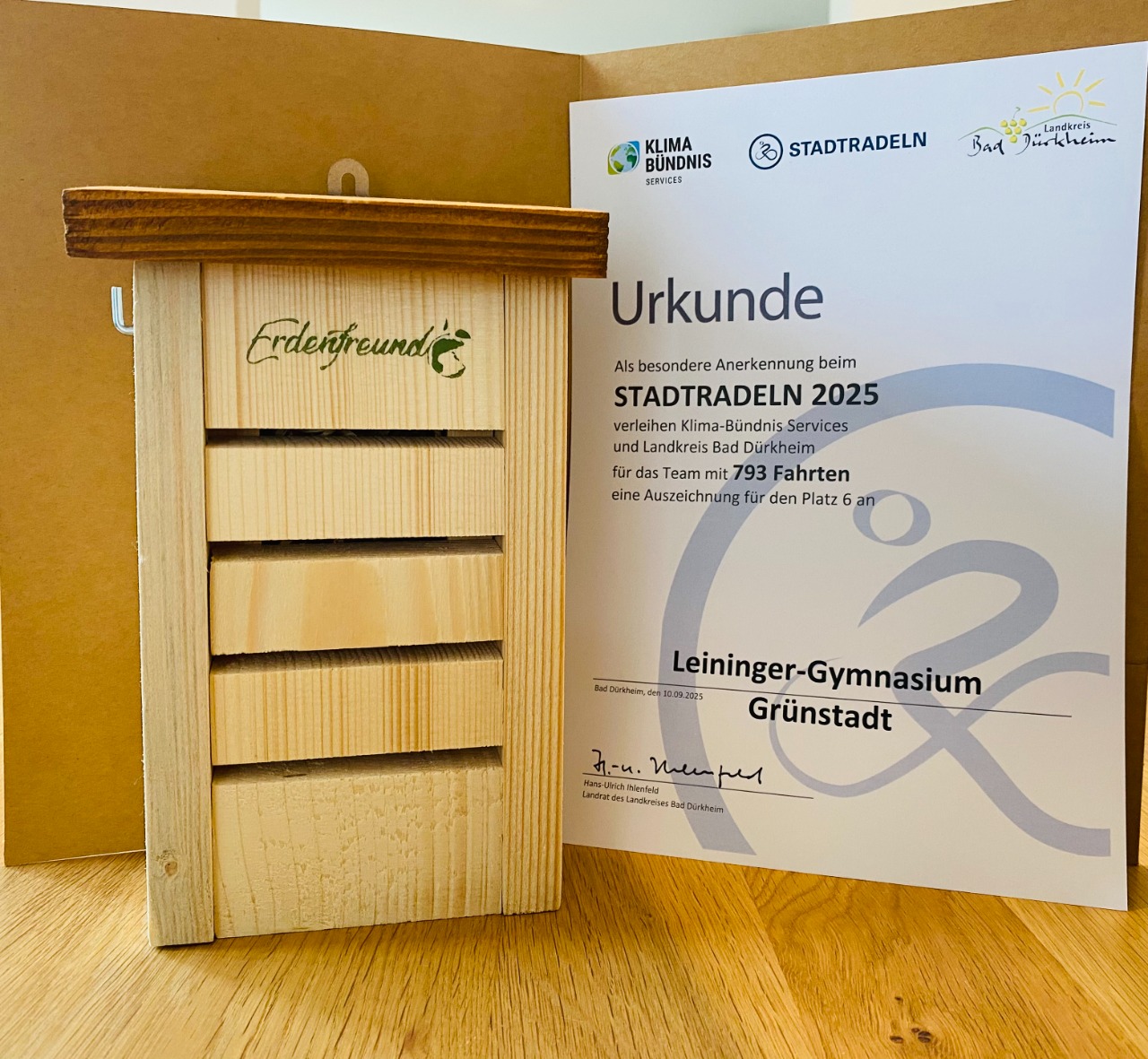 Auch in diesem Jahr nahm das Leininger-Gymnasium wieder bei der Veranstaltung Stadtradeln teil und ging mit insgesamt 42 Radelnden an den Start. Über den Zeitraum vom 11.06. – 01.07.2025 wurden durch insgesamt 793 Fahrten 5039km gesammelt und das Ziel verfolgt, einen aktiven Beitrag für mehr Klimaschutz und einer besseren Radverkehrsinfrastruktur zu leisten. In diesem Jahr gab es nicht nur Preise für die am meisten gesammelten Kilometer, sondern auch für die Anzahl der durchgeführten Fahrten. In der Kategorie Anzahl der durchgeführten Fahrten belegt das Team des Leininger-Gymnasiums im Landkreis Bad Dürkheim den 6.Platz. Für diese tolle Auszeichnung erhielten die Radelnden eine Urkunde sowie ein Insektenhotel, welches auf dem Schulhof aufgehängt wird. Wir danken allen Teilnehmenden und freuen uns schon darauf, im nächsten Jahr wieder gemeinsam mit Euch in den Sattel zu steigen und fleißig in die Pedale zu treten!